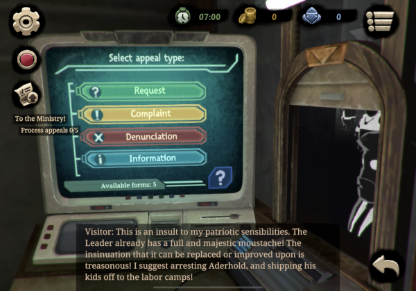 You quickly learn that the timing of your hire is no mystery. There are folks at The Ministry that want to look into your father's death and they implore you to uncover what the government is hiding. As much as you might want to investigate though, you also have to make ends meet by actually performing your job as a lowly bureaucratic cog in a large, terrifying, facist machine.