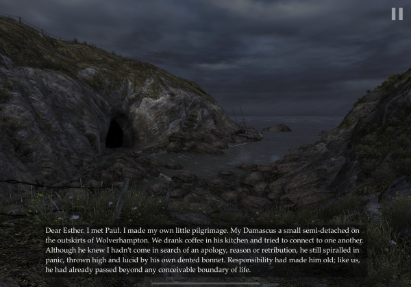 From the outset of Dear Esther, this man doesn't seem to make a whole lot of sense. He talks about seemingly random things in a disparate fashion. The further you get into the game, though, the more these rambling threads start to come together to tell a tragic story. In this way, the game creates a sort of challenge out of interpreting all of the monologues into a cogent tale.