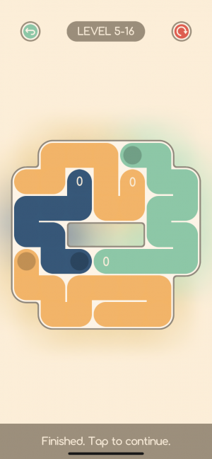 Speaking of puzzling choices, Coloristic 2 also has a somewhat odd control scheme that takes some getting used to. Tapping and dragging to draw lines of color works just fine, buf if you ever need to move backward to take back a move or change direction, Coloristic 2 requires that you tap the origin point of your line to reset the whole thing. There's no way to move back one space or otherwise undo single moves. There's a specific reason for this that you learn as you get further into the game, but there are large chunks of Coloristic 2 where you wish there was a more convenient way to reset and no apparent reasons explaning why you can't.