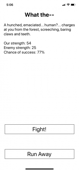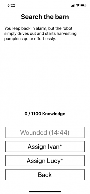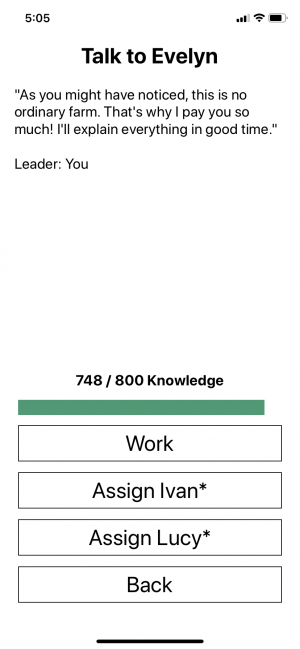 As a clicker, all of this happens through a simple menu system where you tap to perform actions. To talk to Evelyn, for example, you just tap the "Talk to Evelyn" menu item. Some of these items then require additional taps before they trigger the action you want to perform. Specifically, some actions require a certain amount of "Knowledge" or "Strength" to perform them, and tapping repeatedly on buttons can fill the meters you need to trigger an event to keep the game moving along.