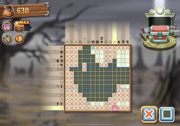 Drawing the objects in PictoQuest isn't just a matter of guessing, though. Much like Picross and other logic games, each level provides just enough information to let you suss out which pixels you should tap on to reveal vs. not. In this game specifically, there are numbers on the edges of your draw grid that tell you how many pixels are in each row and column, and by cross-referencing these numbers with each other and making inferences, you can mostly figure out exactly how to draw each object with few issues.