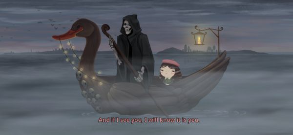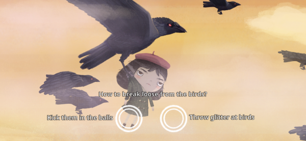 Throughout the experience of playing Little Misfortune, it's hard to get a read on where the game is going. There's a lot of fourth-wall breaking happening upfront, which coincides with the revelation that Misfortune is destined to die by the end of her adventure. After that, there's the revelation that apparently bad things follow Misfortune, which is then borne out in some grisly scenes. All the while, Misfortune is her cheery and clever self, going on about how she loves glitter, is in love with a fox, and has an imaginary friend that only speaks Japanese.