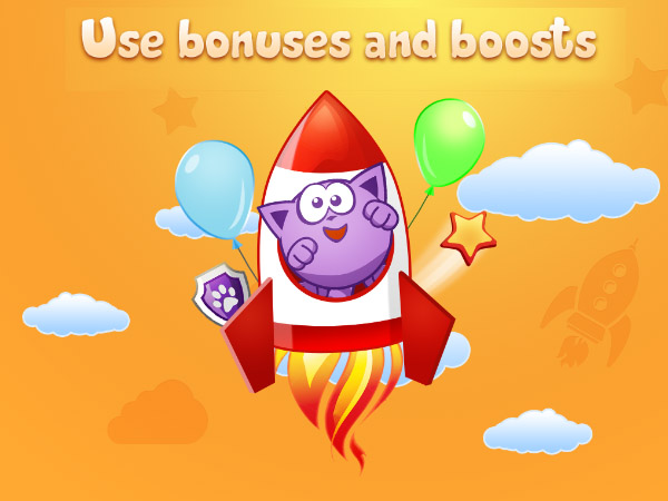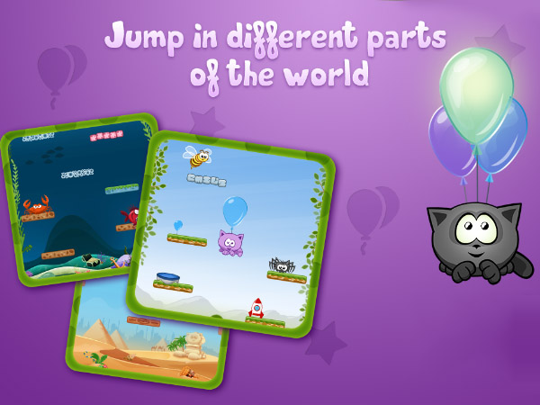 Kitty, cartoon kitten, jumps higher and higher, it collects sausages on the way, tests a rocket, rides a balloon, jumps on a trampoline, avoids the obstacles and wins the monsters.