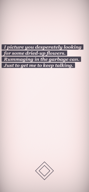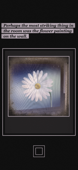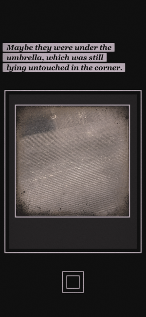 The first odd thing to note about Polarized! is the way it unveils its narrative. Aside from the photo puzzles, the text from the narrator arrives on screen one line at a time, and you have to tap on the screen to bring up a new line. This may sound like a minor annoyance, but it's actually really disorienting. Only being able to see one line of a story at any given time without being able to look back for context makes it really hard to follow what's going on in Polarized!, though it probably doesn't help that the game isn't the most coherent piece of writing to begin with.
