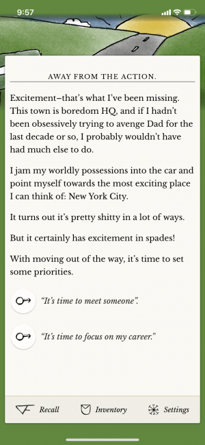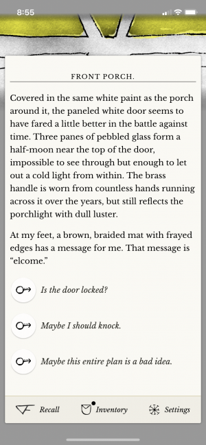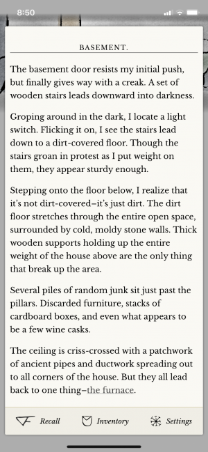 Being a text adventure, your journey unfolds over paragraphs of text, with some light audio stingers, visual effects, and illustrated backgrounds to reinforce and heighten the action being described. The storytelling in Night in the Unpleasant House isn't entirely linear, though. Most of the game takes place within the house, and you have quite a bit of freedom to move between locations, gather items, and solve puzzles in any way that you like.