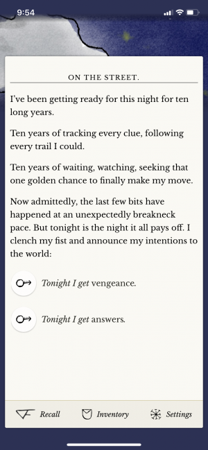 What makes this particularly frustrating is that--for one ending in particular--I felt like I wasn't given enough information in the text to know the kind of decision I was making. In hindsight, it's easy to read the text and know what it was trying to say, but it's also painfully clear what information it was leaving out, and it doesn't seem intentional. Or, if it was intentional, it is a cruel trick to spring on someone really deep into a game that you have to replay nearly in its entirety to get back up to.
