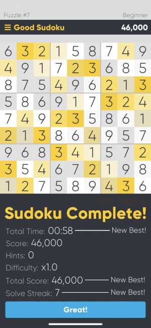 With all of Good Sudoku's tools turned on (my preferred way to play) and some fundamental techniques under your belt, you can zoom through some puzzles in under a minute. Of course, Good Sudoku also has plenty of higher difficulty puzzles that definitely take more time to chew on, but the tools at your disposal make you feel empowered to take them on, make mistakes, and improve.