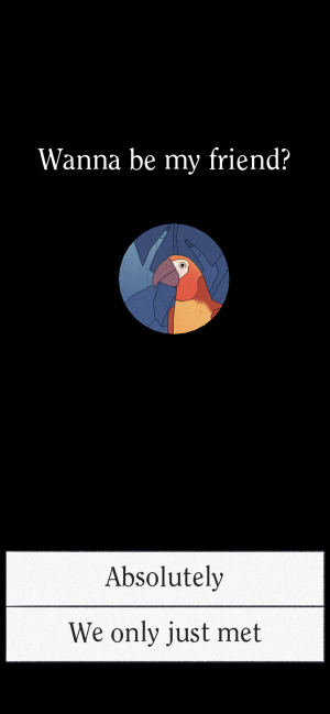 Bird Alone doesn't have any explicit goals, per se. You just open the app when your bird wants to chat and just see what happens. As you keep checking in, though, things definitely evolve and change, and there's a slight throughline between all of your interactions that builds to a narrative conclusion of sorts.