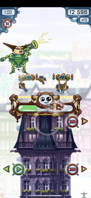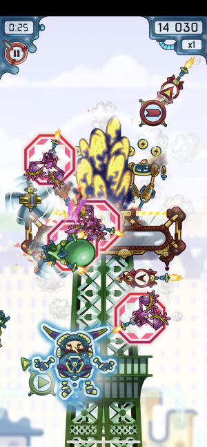 During construction, enemy robots inevitably appear, all of which you have to deal with in different ways. There are termite-like robots that gnaw away at your building meter unless you tap them a few times (to the beat, of course), rockets that you have to swipe to slice in half, and even enemies with shields you must disable through tapping on the off-beat before tapping on them directly. If these threats go unchecked, there's no way you'll be able to construct your building before the song ends, and you'll have to try again.