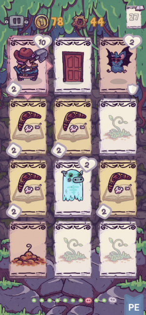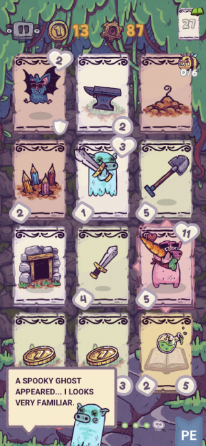 Card Hog creates a "dungeon" by displaying 12 cards from the deck at a time in a grid. This creates the play field and represents your hero's surroundings. One of these cards is the pig itself, who you can swipe in a direction to move onto nearby cards, which will then react according to context. For example, moving onto a weapon will equip it, and moving from there toward an enemy will cause you to safely attack it with the weapon you equipped. If you don't have a weapon equipped, moving onto an enemy will hurt your pig while defeating the enemy. The ultimate goal of Card Hog is to survive as long as possible while defeating bosses and ever-more challenging creatures that appear in your deck.