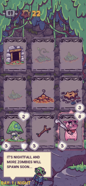 The basic goal of the game remains constant, but Card Hog comes packed with three modes that offer distinct twists on the deck-based dungeon-crawler formula. Dungeon Loops appears to be the standard way to play, and offers opportunities to duck into towns across crawls to spend currencies on card upgrades or deck modifiers. In these towns you can also take on bounties to defeat enemies for bonus items and rewards. Endless Crawl is a more basic mode that simply asks you to survive as long as possible as the difficulty gradually increases. And finally, there's a Zombie Survival mode, which puts you in a smaller grid and adds mechanics that emulate a crafting survival game.