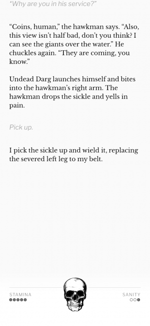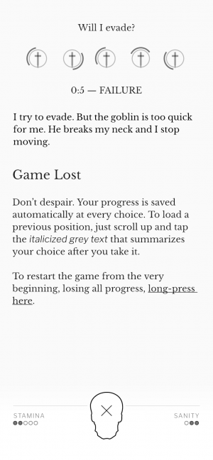 Fights in Knights of San Francisco feel dangerous, since failing dodges or missing attacks can lead to instant death. Your powers of necromancy allow you to bring undead allies into combat who can help you out, but they don't fully protect you from harm. Luckily if you die, Knights of San Francisco lets you scroll back up through your story and tap to resume play from any decision point you made. You can also do this to explore alternatives to other choices you make, which is convenient for a game with multiple endings.