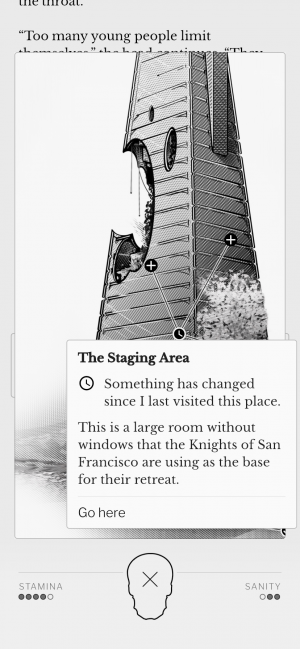 Knights of San Francisco is almost entirely text-based, with only occasional illustrations shaping the world that you otherwise construct in your imagination. The story moves along a sentence or two at a time, and frequently prompts you with dialog choices, action/item lists, and a map for you to move between points of interest, but doing almost all of these things serves up more text to sift through. There are some moments where you can diverge from a critical path to solve a side-puzzle for find a special item, but for the most part Knights of San Francisco is a funnel-like experience pushing you up into the highest reaches of the pyramid.