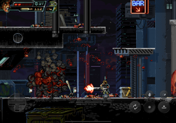 Huntdown was not designed specifically for mobile, as it first appeared on PC and consoles. Even without this knowledge, you could probably tell after just a few minutes with the game. Although the virtual buttons behave surprisingly well in most situations, there is a specific issue with the game's cover system where sometimes the game will just decide when to take cover for you, even if you're simply trying to move past said cover.