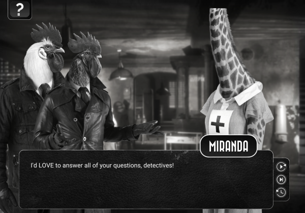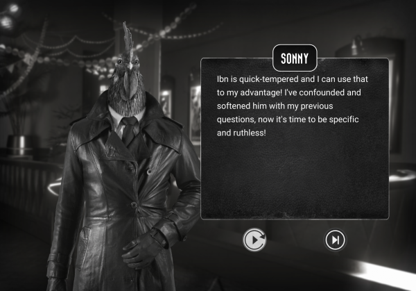 I don't necessarily mind this approach in theory. This ethos also exists in Chicken Police's interrogation sections, where you get rated on your ability to extract information from people. Most of the time, it was entirely unclear to me which dialog choices were supposed to be the right ones, but since making these dialog choices kept the story moving, I didn't mind. It was only when the game wanted to hide interactive environmental elements or simply require me to initiate conversations with people multiple times to move things forward that it felt like the game was intentionally trying to slow me down and make me enjoy it less. These choices all just feel bizarre and unfun. Luckily there aren't too many of them.