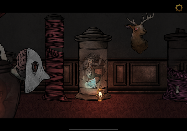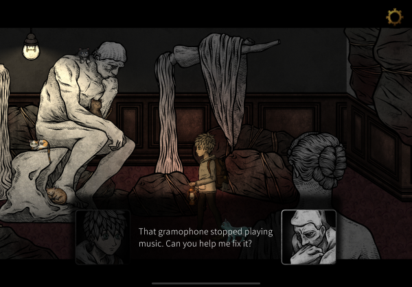 To make your way through Cat Museum, all you have to do is tap on which side of the screen you want the boy to move in and interact with the objects you come across. Many objects simply add some more flavor and commentary on the game world, but others initiate puzzles that unlock new ways forward. None of these puzzles are particularly challenging from a design perspective, but almost all of them feature you interacting with some horrific tools or creatures.