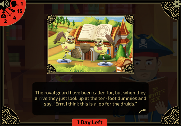 Although Kingdom Catastrophes has you pick a character, choose a class, and level stats, it truly is more like a "choose-your-own-adventure" book than it is a traditional role-playing game. Each day, you pick where you want your character to go, which sets off what is usually a strange vignette where you get a choice or two as to how to respond before being rewarded (or punished) with stat modifiers or a gain/loss of funds.