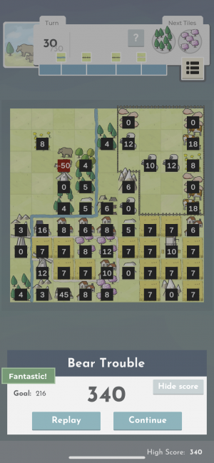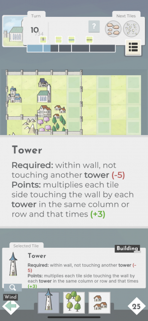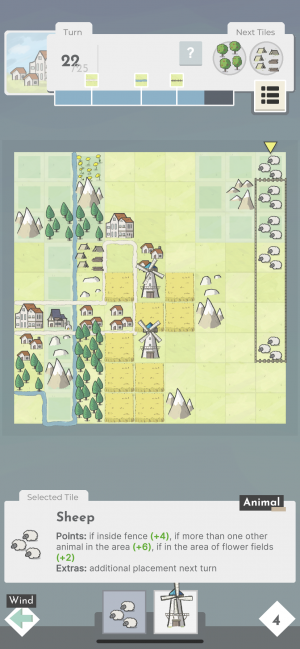 For example, you can score more points for houses if they are placed along a roadway, and windmills score big if you surround them with wheat fields. Every feature you have at your disposal has a clear explanation of its scoring rules and you can also tap on existing features in on your valley map so you can always double-check how new placements might affect them. Games of Square Valley end when you hit a turn limit, which varies based on the mode and/or level you are playing.